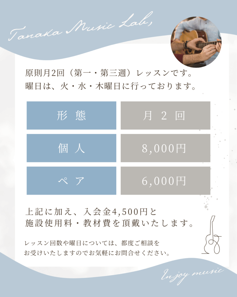 レッスン回数や曜日については、お気軽にご相談くださいませ。